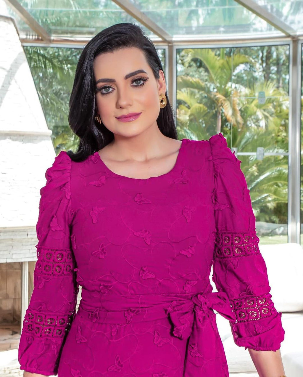 Vestido Dalila todo confeccionado no lase bordado 3D, não possui elastano, forrado, acompanha faixa na cintura, zíper na costa, manga7/8, gola oval.